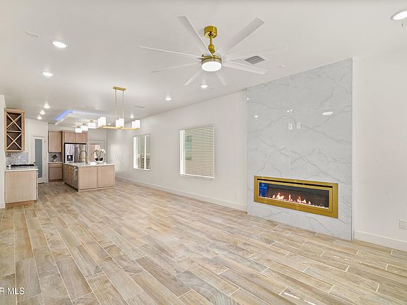 Step inside to find ceramic tile flooring throughout, creating a seamless and elegant flow. The kitchen and bathrooms are finished with quartz countertops, paired with shaker-style cabinetry and upgraded hardware for a refined touch. A suite of **ZLine appliances** makes the kitchen a chef's dream, accented by stylish light pendants that elevate the space.