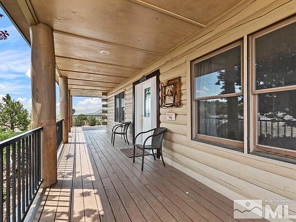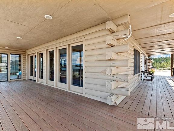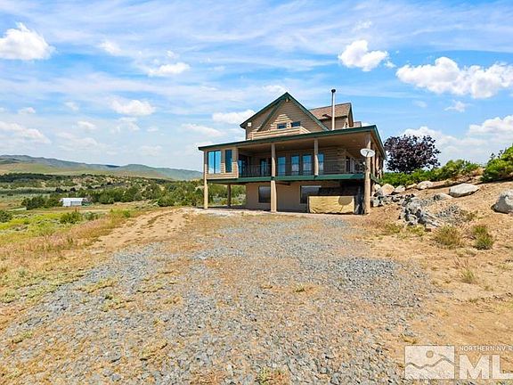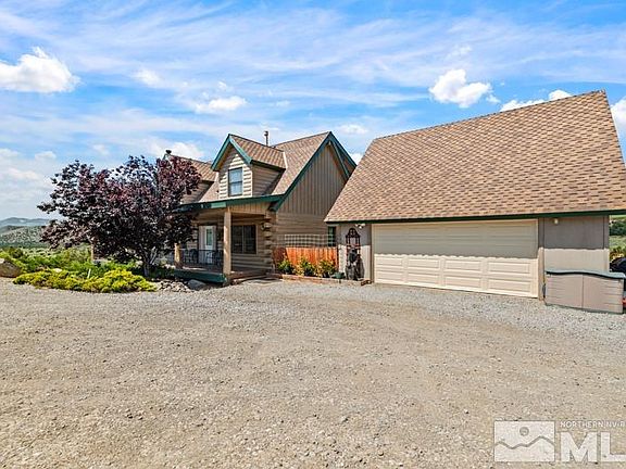 Engineered log home "off the grid." 44.6 acres, beautiful mountain views, bordering BLM land and Peterson Range, less than 25 min. from central Reno. Surrounded by covered decks, west side is enclosed in glass to enjoy in any weather. Main floor includes living area, wood burning stove, dining area, and galley style kitchen, guest bedroom and full bath, and laundry. Upstairs includes master bedroom (with deck) & bath, and second bedroom with bath. Finished walkout basement has two BRs, bath & family room., This unique property has solar and wind generated power, a huge battery pack, and a large diesel generator. There are two fenced one acre corrals with paddocks. Excellent well water and a 10,000 gallon water tank upslope from the home guaranteeing gravity fed water. Detached oversized garage with full attic with stairs for storage. The home is sited with maximum privacy and takes advantage of views all the way to Mt. Rose. Goldstone is located 9 miles from Hwy 385, then one mile on Goldstone.