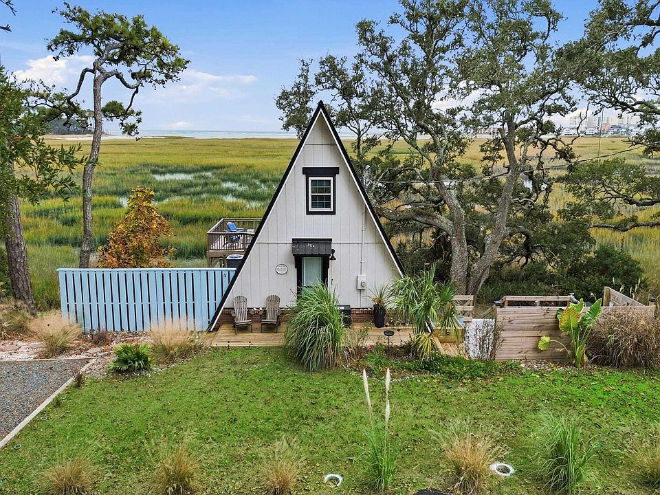Prepare to fall in love with this one-of-a-kind A-Frame marsh front cottage, offering breathtaking panoramic views of the North Myrtle Beach marshes and the Atlantic Ocean. This fully furnished 2 bedroom, 1 bath retreat is truly turnkey — complete with a hot tub, upgraded systems, and strong rental history. All appliances and washer/dryer convey! Tucked away like a hidden gem yet only 10 minutes from Cherry Grove Beach, this home delivers rare peace, privacy, and nonstop natural beauty. Floor-to-ceiling windows showcase the views from both the main living area and the loft bedroom. Watch egrets glide across the water, hear oysters crackle as the tides shift, and enjoy regular sightings of bald eagles, painted buntings, hummingbirds, and more — all from your own back deck. The charming A-frame design creates a warm, inviting atmosphere that blends the kitchen, dining, and living spaces. Outside, you’ll find a spacious deck with a private hot tub, fire pit, and plenty of room to relax and entertain. Recent upgrades include: -New Carrier coastal-rated HVAC system installed in 2023 (built to withstand harsh coastal conditions). -Ecobee WiFi smart thermostat with remote sensor -Door and window motion sensors synced to Ecobee for comfort, efficiency, and added security -Metal roof (replaced 3 years ago) 100 Yards of Road Frontage With NO HOA, both short-term and long-term rentals are allowed, making this an ideal investment property or a perfect full-time coastal residence. Located within golf-cart distance to the beach, restaurants, golf, shopping, and everything Cherry Grove/North Myrtle Beach has to offer. Homes like this rarely come available — this is your chance to own a truly unique coastal escape. *Excellent rental history, consistently ranking in the top homes in the market. The property maintains an impressive year-round occupancy, even throughout the off-season. Available upon request! Ask agent for more details!