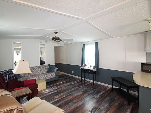 This immaculate ranch has been meticulously cared for and thoroughly renovated during the past few years. Improvements have included a completely remodeled bath (Vanity, Tub, Shower, and Floors), and new floor covering throughout. The home sparkles from the modern picture window in the front to the inviting private bedroom in the rear. The replacement siding and convenient side deck are a bonus. What a great way to start the New Year! The home is in one of the most popular and well-cared Mobile Home Parks in the area - Champion Park offers part ownership (Co-Op opportunity) to all members – this may be one of the reasons the lot rent ($370 per month) is significantly lower than other Parks. Where else can you live for $370 per month and have that cover your taxes, lot rent, water, garbage pickup, and maintenance of common areas? The location is nearly perfect: just 20 minutes from Auburn or Syracuse and within 10 minutes of one of CNY’s most popular tourist attractions - Skaneateles Lake and Village. Modern appliances and all furniture included!