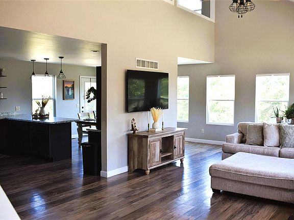 Stunning 4 Years New 1.5 Story home with 3+ Beds/2.5 Baths on 20 lovely level acres is perfect for hunting the abundant deer & turkey on property. Enjoy nature & trails & your own egg laying chickens w/coop. Covered front porch is perfect to enjoy the peace & quiet. Inside you are greeted by soaring two story ceilings, Engineered wood floors & Open floor plan. Expansive living room opens to custom kitchen w/beautiful cabinetry, granite-look counters, newer SS appliances, refrigerator (in kitchen) is less than 1yr new, breakfast bar, pantry & opens to the large breakfast room. Primary suite has large walk-in closet w/stack wash/dryer hook up & luxury bath w/large tiled shower, double vanities, freestanding tub. Half bath on main. UL has 2 spacious beds, full bath & rec/office room could easily be 4th bed. Walk out lower level has 9ft pour, rough in & is ready to finish. New water softener, dual heat/cool sys. Private setting, but close to highway & major convenient amenities.