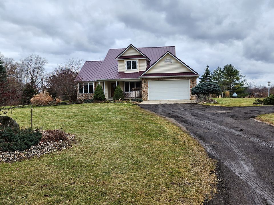 Beautiful home on over 2 acres, country feel but close to amenities, soaring ceiling in the living room, vaulted ceiling in the primay bedroom, large primary bath with jetted tub and walk in closet, large kitchen/breakfast room which opens to the living room, and formal dining room, huge unfinished basement with lots of potential for storage or a rec room. Carpets have been professionally cleaned. Newer Metal roof, Propane tank has just been filled.