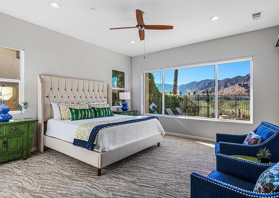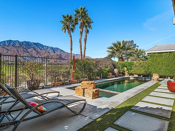 Set within the exclusive Escena community, this private residence enjoys its own gated entrance, providing access to a secluded section of the complex while still offering the luxury of being on the golf course. The open-concept design features soaring high ceilings throughout, seamlessly connecting the living, dining, and kitchen areas in a modern, inviting space.This residence includes 3 bedrooms, all of which are en-suite, offering a serene retreat for everyone. An additional room could be used as a den/office or 4th bedroom. A 2-car garage and owned 28 solar panels add practicality and energy efficiency. The backyard is an idyllic retreat, with a covered patio that overlooks the breathtaking San Jacinto Mountains and the golf course. Sculptures around the pool and sundeck create an artistic ambiance, while the spa provides a perfect spot to relax and take in the stunning views. At the center of the layout, a private courtyard offers a cozy space for dining or lounging by the fire pit. This section of Escena has it's own private gated entrance to the clubhouse and golf shop area at the end of the street. Located off the beaten path yet close to all the best Palm Springs has to offer, this property combines modern luxury with natural beauty in a peaceful, exclusive setting.