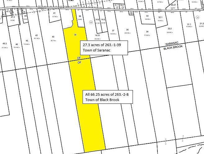 93.55 acres in the towns of Saranac and Black Brook. 6.3 acres of the Saranac parcel are NOT being sold and have been surveyed off the parcel. The survey map is enclosed with the listing. All of the Black Brook parcel is being conveyed. Assessed values is approximate and taxes of the Saranac parcel will be determined by the town after the sale. APA Low Intensity in Town of Saranac, Rural in Town of Black Brook. APA Jurisdictional Approval complete, approved and available. Land includes part of Columbe Mountain. The south part of the Saranac parcel climbs to 1,400' before reaching Columbe Mountains 1,500' elevation. The acreage has been select cut a year ago. The address used is approximate for mapping purposes and may not be an actual "911" address.