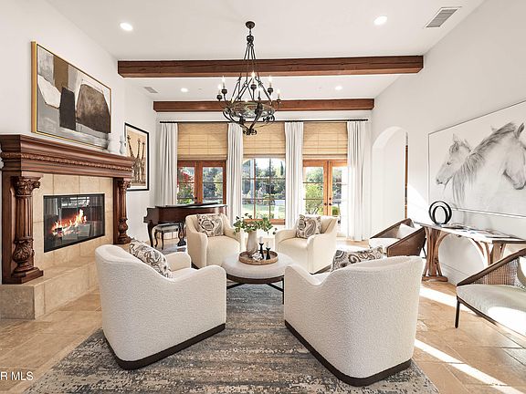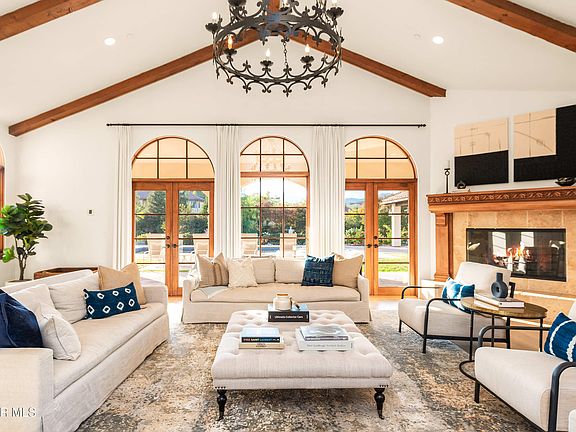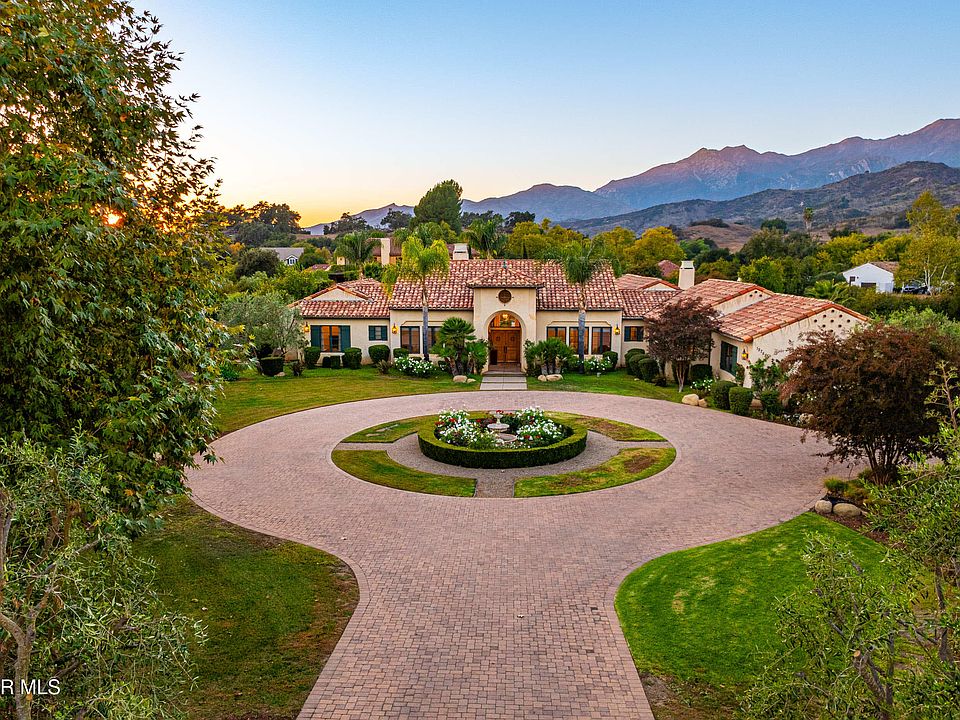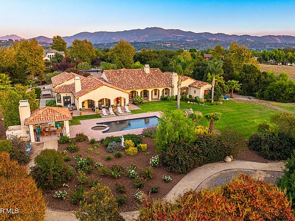 Property is also available for lease, furnishings negotiable. Nestled within the exclusive gated community of Rancho Matilija, this upgraded Montecito-style estate exudes the finest quality of living. Panoramic mountain views surrounding the over 2-acre parcel offer a breathtaking natural backdrop that adds unparalleled beauty to daily life. The property welcomes you with a grand circular driveway, mature olive trees, and a wide variety of lush landscaping. Step inside to discover high-quality upgrades that enhance the home's appeal. With 5 bedrooms and 5.5 bathrooms, the home boasts a spacious, versatile layout. Vaulted ceilings, new engineered wood, terrazzo stone, granite countertops, and hand-painted tiles are just a few of the features that make this a one-of-a-kind property. The grand foyer entry opens to the home's immaculate spaces, including a formal living room, an impressive dining room, and a refined library/office. Ideal for entertaining, the kitchen features a walk-in pantry, butler's pantry, 1,000-bottle wine cellar, and wet bar—all framed by arched windows with stunning backyard views. This space flows effortlessly into the expansive great room, creating an inviting setting for gatherings. Heading down the hallway, the primary bedroom retreat unfolds as a peaceful oasis, designed for ultimate relaxation. It features an expansive walk-in closet and a spa-like bathroom with a soaking tub and dual vanity, offering luxury and functionality. This serene space is the perfect escape within your own home. Each additional bedroom offers a private en suite bathroom, and there are spacious guest quarters to accommodate extended stays. The meticulous attention to detail continues outdoors, with a refreshing pool and spa, a lush orchard with fruit-bearing trees, garden beds for farm-to-table meals, a convenient storage shed, and a spacious cabana with a fireplace. Enjoy summer evenings in the backyard with Ojai's renowned ''pink moment'' views. Owned solar with Tesla battery backup, a temperature and humidity-controlled wine cellar holding up to 1,000 bottles, and panoramic mountain views complete the experience. Rancho Matilija is an exclusive gated community of 114 parcels known for its legacy trees, wide streets, and distinctive architectural homes. This exceptional property is also strategically located just minutes away from Ojai's best shops and eateries. Enjoy the convenience of proximity to the world-renowned Ojai Valley Inn and Spa, adding another dose of luxury and leisure to your daily life. Fully fenced yard and private, this estate epitomizes premier living in Ojai, offering both serenity and access to the creative local scene. Property also available for lease.