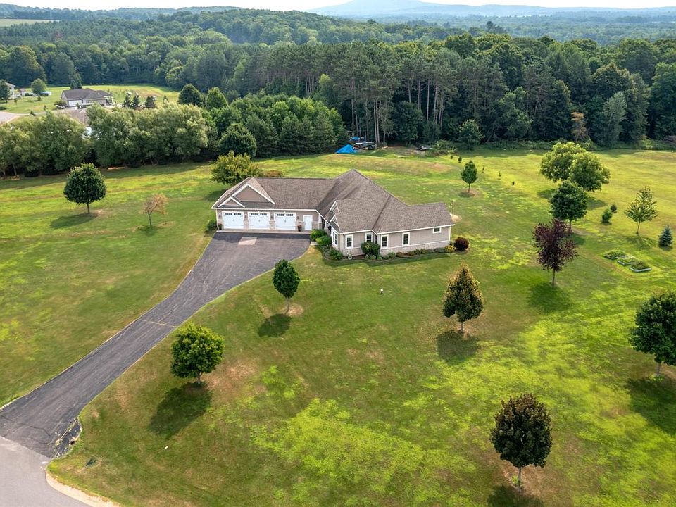 Welcome to this gorgeous 2013 Parade Home built by Royalty Homes, where exceptional craftsmanship meets timeless design. Nestled in the sought-after Fieldstone Meadows Subdivision (Town of Stettin), this Executive Ranch offers an open-concept floor plan with a desirable split bedroom layout. Step inside to find 9-foot ceilings throughout the main level, complemented by rich, hand-carved solid hickory wood floors. The gourmet kitchen flows effortlessly into the dining and living areas?perfect for entertaining?and features scenic views of rolling hills, with walk-in pantry, stately granite countertops, and soft-close cabinetry. Dining and living areas offer picturesque views of the backyard. A new Renewal by Andersen patio door (2023) off the dining room opens to the back patio?perfect for grilling, entertaining, and soaking in the peaceful charm of this country neighborhood. The Primary Suite boasts a trayed ceiling, dual vanities, separate walk-in closets, and a spa-inspired bath with a walk-in Roman shower, all accented by premium tile from Scottie?s Interiors.,The main floor also offers a cozy study with French doors, a stylish half bath, a welcoming living room with a striking stone fireplace and stone and wood pillars (which are not structural and could be removed) with backyard views, two spacious Jack-and-Jill bedrooms each with walk-in closets, a full shared bath, separate main floor laundry, and a mudroom with custom cherry lockers. The lower level includes a fourth bedroom with a walk-in closet, a full bathroom, wet bar, and a versatile split family room ideal for billiards, media, or entertaining. A large unfinished area offers potential for a future theater room, golf simulator, workout room or additional living space. Additional features include a delightful front porch to see the breathtaking sunsets, Smart Board siding, seamless gutters, and an oversized, insulated, and heated 3-car garage complete with separate floor drains. Elegant plastered walls, recessed tray ceilings with hidden lighting, and solid maple trim with three-panel doors add warmth and sophistication. All fixtures are premium KOHLER selections from Ferguson, and flooring and tile were sourced from Scottie?s Interiors and Macco?s. Set on a beautifully landscaped 2.62-acre lot, this property enjoys sweeping views of the surrounding rolling countryside. Twenty-two thoughtfully planted trees?including Lindens, Crabapples, Maples, and Japanese Lilacs?enhance its natural beauty. The current owner obtained approval for additional garage space, with a 24? x 20? area already prepared with road base, ready for future construction. Ideally located near Pine Valley Golf Course with High Speed Spectrum Internet, Natural Gas utility and Wausau West School District this home blends luxury, comfort, and an exceptional setting in one perfect package.