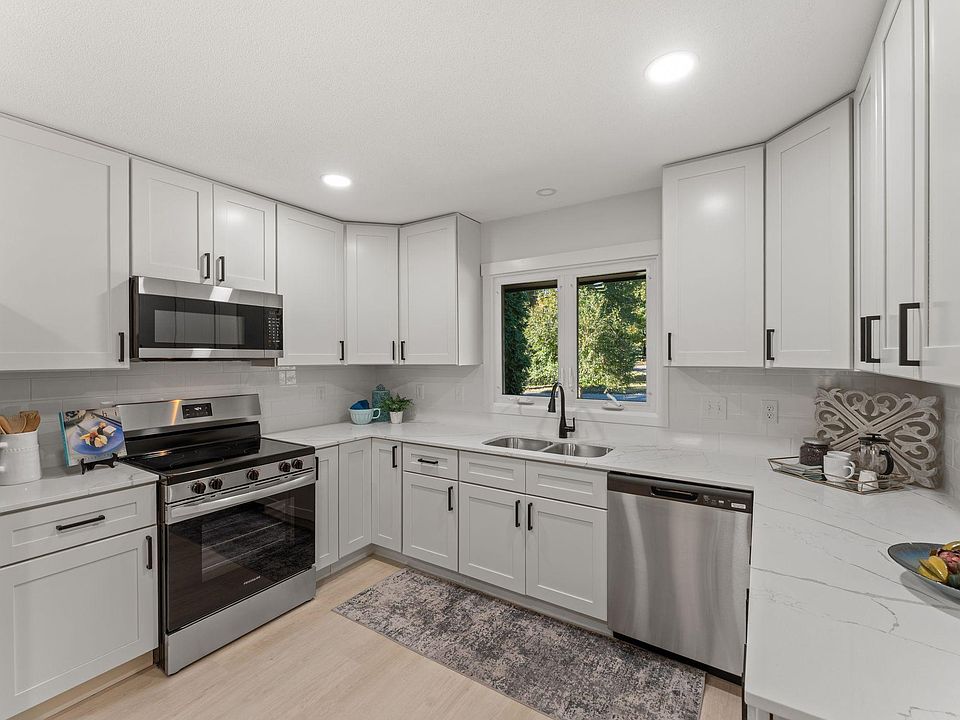 Beautifully updated 4 bedroom, 3 bath home with a 2 car garage! This home features a stunning custom wooden front door and welcoming stone entryway, setting the tone for the quality updates throughout. Inside, you’ll find new flooring and fresh paint, along with modern light fixtures that brighten every space. The kitchen has been completely remodeled with new cabinets, quartz countertops, and stainless steel appliances. The living room offers a cozy fireplace and a picturesque view of the backyard’s mature trees. Two bedrooms feature attached bathrooms for added convenience. The walkout lower level includes another fireplace, ensuite bedroom and room for a workshop. Enjoy the private backyard, perfect for relaxing or entertaining. Easy to show. Quick close possible.