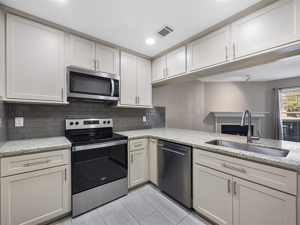 Beautifully Remodeled Condo — Move-In Ready! Fall in love with this stunning home featuring an updated kitchen with granite countertops, glass backsplash, and stainless-steel appliances. Refrigerator, washer, and dryer all included —for true turn-key living! Fresh neutral paint and carpet gives that “new home” feel throughout. Open living room with fireplace open to spacious dining area to entertain with ease. Main floor powder bath too! Enjoy parking just steps to the front door and plus community pool access for relaxing weekends. The low-maintenance lifestyle means no worries about exterior upkeep or the roof! Upstairs to two spacious bedrooms and two full baths, including a private primary suite with walk-in closet and bath. You’ll love having two outdoor spaces—a main floor patio for morning coffee and upper balcony off both bedrooms —to unwind. Perfect location with quick access to Beltway 8, 249, & 290. And best of all, the price is right! WELCOME HOME!