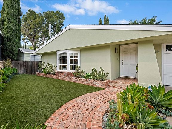 Step inside to discover beautifully refinished maple hardwood floors flowing throughout the main living spaces and bedrooms, complemented by designer tile in the kitchen and bathrooms. The open, modern layout is filled with natural light thanks to large architectural skylights and solar tubes, offering soothing views of lush greenery and the sparkling blue pool—creating a seamless connection to the outdoors. The gourmet kitchen has been remodeled with a designer’s touch, featuring a professional-grade Dacor gas range and oven, sleek finishes, and an improved layout that enhances flow and sightlines. The spa-like primary bathroom is a true retreat, complete with glass mosaic tiles, a large walk-in shower with built-in bench, and premium Kohler fixtures. This home has been extensively upgraded with quality in mind, including a newer roof, HVAC system, copper plumbing, relined sewer main, updated electrical panel, and water heater. Energy efficiency is built-in with double-paned windows and doors, attic fans, fresh insulation, Nest thermostat, and solar heating for the resurfaced fiberglass pool along with a covered gas heated in-ground spa—allowing for extended seasonal use and reduced utility costs. The oversized front multipurpose room offers incredible flexibility—currently used as an office and exercise space, it can easily be converted into two additional bedrooms. Outside, the professionally landscaped resort-style backyard features mature drought-tolerant plants, fruit trees, a large patio, firepit, and generously sized side yards with substantial storage spaces. Enjoy peace of mind and convenience in this quiet, friendly community with top-rated schools (Van Gogh Charter Elementary & Robert Frost Middle), walking distance to O'Melveny Park, Bee Canyon Park, and local mountain trails, and no interior steps—ideal for all stages of life. Lovingly cared for by long-time homeowners with attention to both visible upgrades and critical systems, this home is truly move-in ready and in like-new condition—just bring your toothbrush!