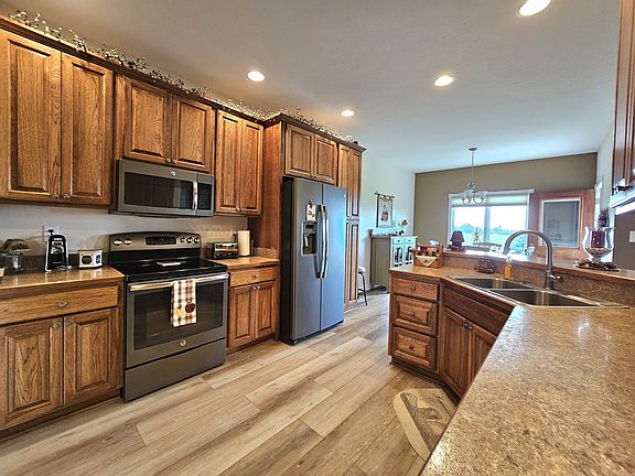 Enjoy maintenance free living in this spacious 2BR, 2BA, all brick custom home! Beautiful sunsets every evening may be seen from the covered back porch, or through the large windows in your cozy living room. You'll find many luxuries throughout including 9' ceilings, large walk-in master closet, oversized custom Hickory cabinets with soft close drawers, NEW luxury vinyl plank flooring in the kitchen/dining. Never worry about yard work again! HOA takes care of mowing, fertilizing, mulch once a year, snow removal and trash. Custom Levelor blinds, Updated "Smudge Proof" GE appliances, Washer/Dryer are all included.