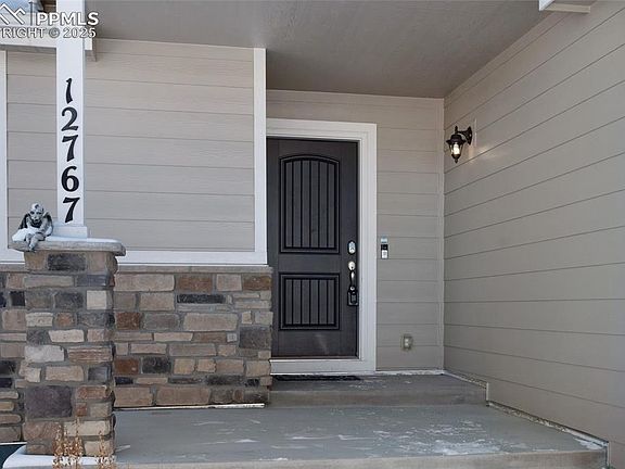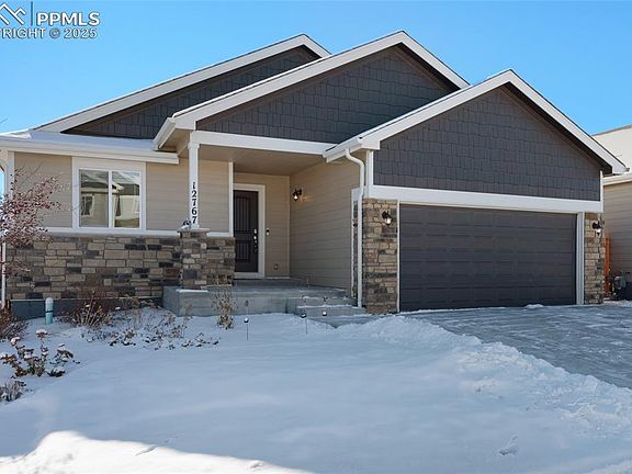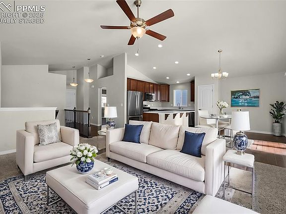 Welcome to this meticulously maintained newer ranch home in the desirable Windingwalk at Meridian Ranch community. Situated on a premium oversized lot with no rear neighbors, this property offers privacy, mountain views, and a small-town feel with proximity to walking trails and open space. Step inside to an inviting open layout featuring vaulted ceilings and a crisp, clean color palette. The kitchen is a chef’s delight with a gas range, center island, quartz countertops, and ample cabinetry adorned with crown molding. The adjacent dining nook opens to a spacious deck where you can enjoy breathtaking views of Pikes Peak. The main level includes two bedrooms thoughtfully positioned for privacy, including a vaulted primary suite with a walk-in closet and a luxurious five-piece en-suite bath. Convenient main-level laundry with included washer and dryer and handy access to the garage. The fully finished walk-out basement provides even more living space with a large family room that leads to a patio and fire pit, perfect for unwinding. Two additional bedrooms and a full bath offer versatility and room for everyone. The expansive private backyard features newly installed sprinklers and lush grass, making it ideal for springtime fun with kids or pets. Enjoy Meridian Ranch’s top-notch amenities, including walking paths, a state-of-the-art pool and fitness center, a golf course, and more. This move-in-ready gem is waiting for you to call it home! This listing has virtually staged photos.