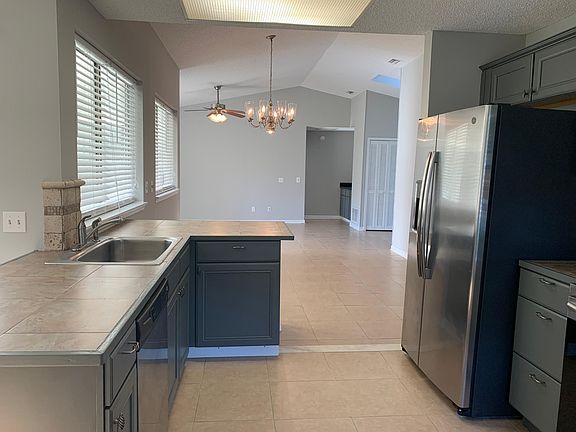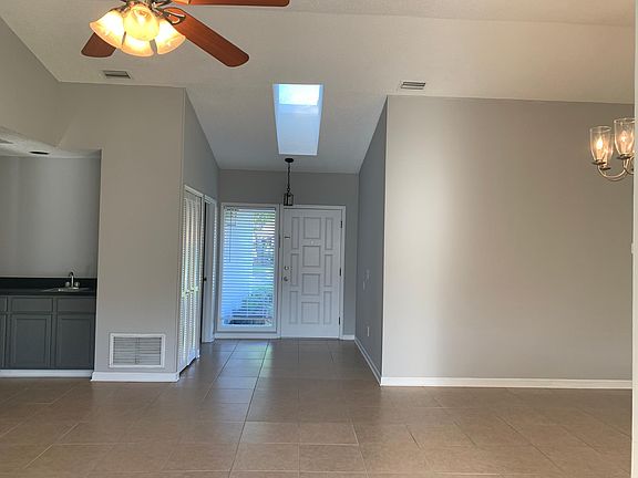 A beautiful contemporary home with 3 bedrooms and 2 baths with a spacious open floor plan with formal dining room, kitchen and breakfast room all part one main open area and ceiling fans thought the house. The house has lots of natural light with large windows (and sky light in the main entrance). The kitchen has grey wood cabinets, stainless steel appliances, side by side refrigerator, large deep sink, microwave, dishwasher and extra wide counters. The living room has vaulted ceilings, a charming fireplace and sliding doors to an enclosed porch. The entire house has porcelain tiles and the interior has been freshly painted in a neutral grey color. The master bedroom has sliding doors to the back yard, a large walk in closet and a private bath with double sinks with separate tub and toilet area finished with marble tiles on wall and floors. The house also has a 2 car garage (with automatic garage door opener), laundry room, sprinkler system with well water and a large fenced in back yard (great for children and pets!). The house is located in the Indian Springs subdivision, Indian Springs is a quiet, friendly subdivision, offering a community pool and tennis courts -- and is located minutes from the beaches, Mayo Clinic (8 Miles from Mayport and 4 miles to the beach!) Lawn care is your responsibility.
