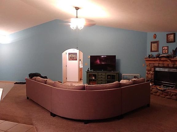 This home features vaulted ceilings and a gas fireplace in the open, airy common area with the kitchen, dining, and living space separating the master bedroom from two bedrooms and a full bath. The master bedroom contains a full bath with a jetted tub and spacious walk-in closet.