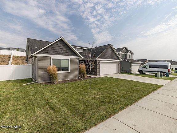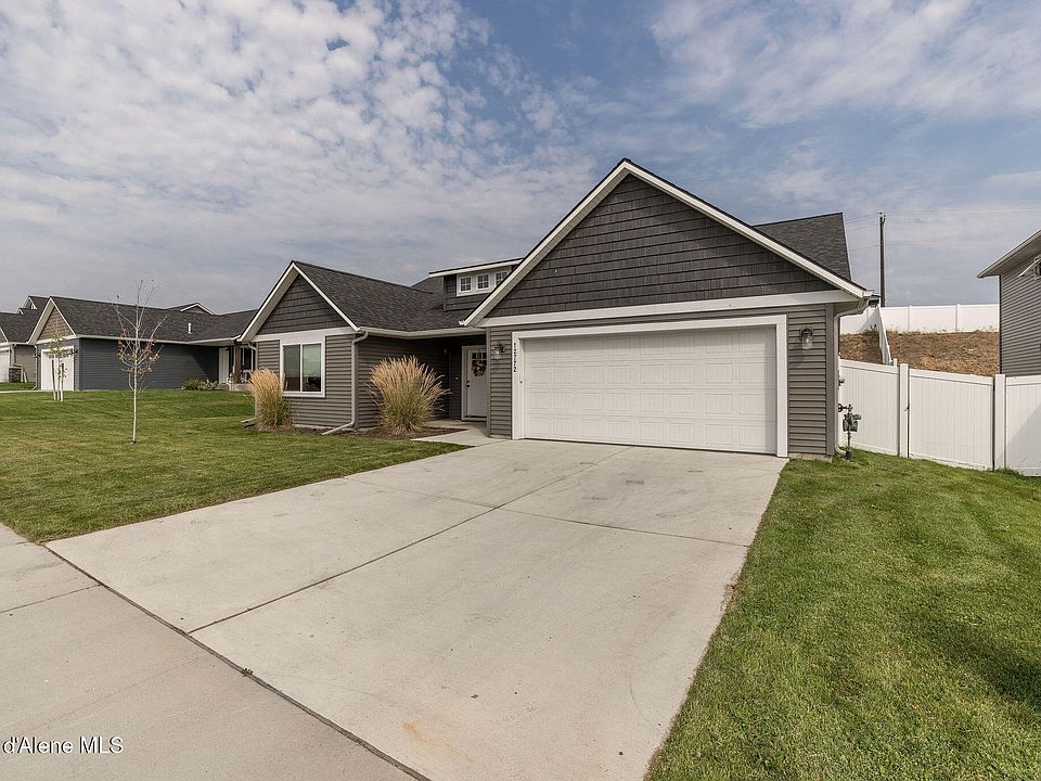 Welcome to this beautifully maintained, like new 2022 built home with 1,613 square feet of single-level living on a .20-acre lot. The floor plan features an open concept design with vaulted ceilings, a large kitchen island, and seamless flow into the dining and great room, perfect for entertaining and everyday living. The primary suite includes a walk-in closet, walk-in shower, and dual sink vanity, while two additional bedrooms and a full bath provide space for family, guests, or a home office. Enjoy the outdoors from your covered front porch or relax on the covered back patio overlooking a fully fenced and landscaped yard. With an attached two-car garage, upgraded kitchen with quartz countertops, and a stone fireplace, this move-in ready home combines the benefits of new construction with the convenience of an already settled neighborhood. Located in Brookshire, just minutes from schools, parks, and a quick drive to Coeur d'Alene or Spokane.