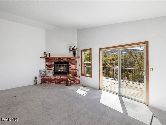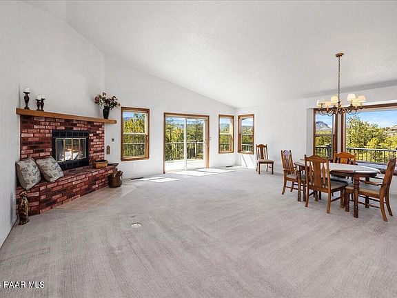 Sitting on 2.13 acres on a paved private dead end road with panoramic views of Thumb Butte from a living room window seat and decks. Super private back yard, with elevated views. One owner home meticulously maintained throughout the years, new roof 2015, new heater 10/2023, chimney cleaned every year, all new vinyl windows/sliders 2018, gutters replaced, new tile in bathrooms, new kitchen floor 3/2024, aerobic septic serviced 2/2024. Charming brick corner fireplace in the LR, split bedrooms, island kitchen with cook top, dbl ovens, pull out spice rack & shelves, cookbook shelves & pantry cabinet. Premier location 5 minutes to downtown. Manzanita Hill Rd has their own Road Maintenance agreement, $150 year fee.
