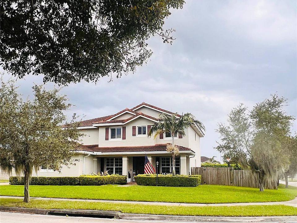 Beautiful model-like impeccable corner 5 bedroom, 3 bath home. Foyer entrance surrounded by living and den rooms plus an open updated kitchen with stainless steel appliances, wood cabinets and granite counter tops. Adjacent is the open high ceiling family room with outside patio/pool view. One bedroom and one full bath are conveniently on the first floor. The wood staircase leads to the spacious master bedroom with private bath that includes a bathtub plus shower combination, his/hers sinks, plus a walk-in closet. The other three bedrooms are roomy and immaculately kept. A sparkling infinity pool and covered patio in backyard are great for entertaining along with a basketball court area. The 3-car garage plus space for 6 more cars is a plus. The perfect home for a large family.