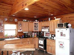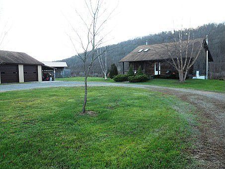 Down the 600' apple tree lined driveway you'll find this nicely sited log cabin on over 5 acres with distant views. Skylights flood light into living room. Open floor plan. The kitchen features a heartland gas stove and beautiful hickory cabinetry. In the finished lower level you'll find a spacious family room, bedroom, and hobby room/den. Over sized 3 car garage with 10'ceilings and additional shed. Emergency generator supplies power for the garage and house. Heated with wood, coal, electric.