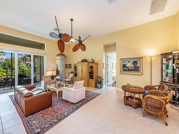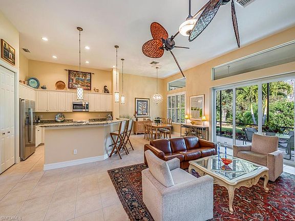 Sophisticated, stylish and timeless, this Silverthorn Court home, situated on a cul-de-sac with lush garden views is on one of the largest lots in Hunters Ridge Golf & Country Club. Beautifully appointed rooms flow effortlessly for gracious entertaining. The foyer opens to a dramatic great room with sliding doors capturing the exquisite and serene outdoor ambiance. Appointments in this four bedroom, three bath home include 10' to 14' ceilings, impact resistant glass, a chef's kitchen for the culinary enthusiast with granite counter tops and top of the line stainless steel appliances, tile and Acacia wood floors and an en suite master bedroom with two custom walk-in closets. The tranquil picture window Lanai with travertine floor is the perfect gathering place to enjoy good food and conversation. Room for a large pool. Offering a resort style atmosphere, this private country club community features an eighteen hole golf course, swimming pool with food & beverage service, renovated clubhouse, grill room and dining room, tennis and pickleball courts and is convenient to great shopping, dining, entertainment, and the RSW Airport.