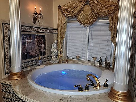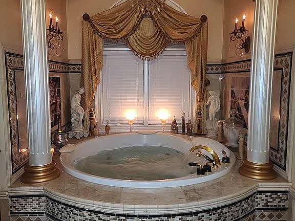 The en suite bath with heated floor will make you feel like you’ve entered your own personal spa. The taking 75" Kohler Riverbath tub with waterfall alone includes intricate tile and handpainted marble details, columns, and a chandelier. The space has a walk-in steam shower with multiple bodysprays and shower heads, and his and hers vanities.