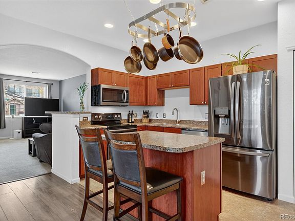 Welcome to this desirable end-unit townhome in the sought-after Sage Creek Townhomes community of Thornton. Step inside to a spacious front living room featuring a cozy gas fireplace—an inviting space to relax or gather. The open layout flows into the kitchen and dining area, complete with Corian countertops, stainless steel appliances, and an island with breakfast bar seating for casual meals or entertaining.