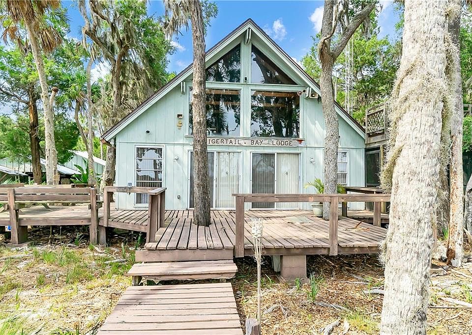 Tiger Tail Bay Lodge. This A-Frame style retreat is located directly on the Homosassa River Over 1900sq ft, huge loft area, rustic fire place, metal staircase. Beautiful wood ceilings and walls.Great outbuilding to store all your toys. New dock, and decking leading up to your wrap around porch Incredible views and only minutes to the open waters of the Gulf. Ideal weekend getaway or possibly a vacation rental. Boat only access. More pictures soon!!