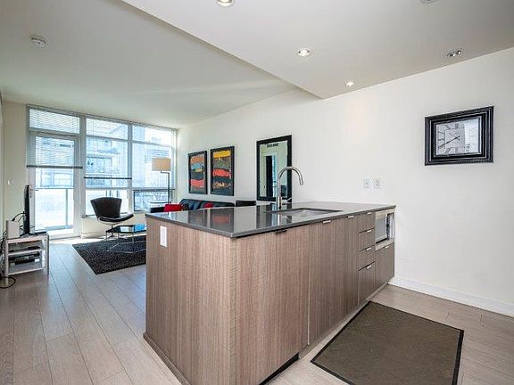 Inside, you will find an open-concept living space filled with natural light from floor-to-ceiling windows. The contemporary kitchen features sleek cabinetry, quartz countertops, and stainless steel appliances, making it as functional as it is stylish. The living area extends to a private balcony, where you can unwind and enjoy city views.