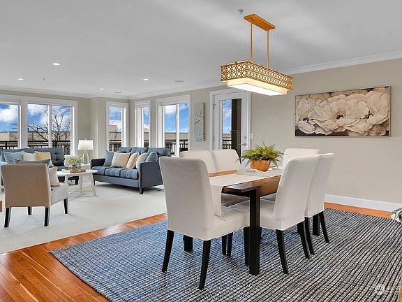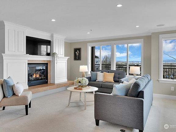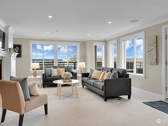 Perfectly located in the heart of downtown Edmonds. Breathtaking views of the sunsets, mountains and Puget Sound. Watch the ferries & ships sail by. This home boasts a wrap-around deck. Spacious living and dining room includes a gas fireplace. The chef's kitchen is equipped with Viking appliances & warming drawer. The large primary bedroom includes a gas fireplace, a soaking tub, two custom closets, cabinets & stunning views. Beautiful cherry wood floors. The home features three bedrooms, two & a half baths, two covered parking spaces & a storage unit for convenient living. Walk to restaurants, shops, theaters & beach. ALL ON ONE FLOOR.