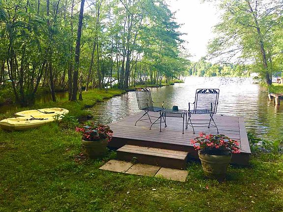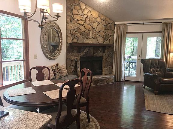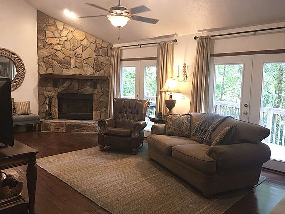 Ready for the lake life? Bring your pontoon! This cozy lake cottage has been completely updated and is move-in ready. With .82 acres on a quiet cove, you will have plenty of privacy and room to explore. Lovely setting by the lake at the newer dock and the owner is leaving the two kayaks! The entry to the house is a nice front deck porch with a wrap around walkway going to the rear deck! Inside, the open floor plan design is highlighted by a beautiful stone corner wood-burning fireplace and 2-story high ceiling with a ceiling fan light and open stairs and walkway for the two bedrooms upstairs. The updated Kitchen is open to the Dining/Great Room so it offers a nice entertaining style of floor plan! The Kitchen features granite countertops, freshly painted cabinets, stainless steel appliances and a Laundry closet (which has been utilized as a large pantry). Also, the Master Bedroom and bath are on the main level. The upstairs 2 bedrooms have a full bathroom between them. The Lower Level offers a large Den or Entertainment room with two ceiling fan lights, a bedroom, bathroom, kitchenette/wet bar, and laundry connection. In essence, the Lower Level could be used as an in-law suite or separate living quarters, plus it has doors out to the Patio area (covered by the upper deck). Please see Associated Documents for a List of the many updates done to the home as well as a list of the furnishings being included! Home is being sold with a lot of the furnishings in place! 1-year home warranty being provided by seller. Home has a termite warranty in place. SELLER IS A LICENSED REALTOR.