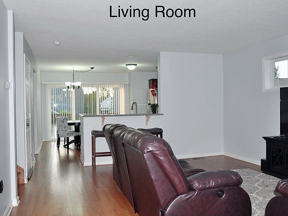 There are hardwood floors throughout the first floor, which includes the kitchen, dining and living spaces. Upstairs and in the basement, soft white carpeting covers the bedroom floors.