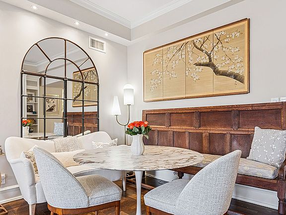 The extraordinary primary bedroom suite also faces the park and includes a full wall of closets and a luxurious, spa-inspired en-suite bathroom with double custom vanities and marble throughout. The second bedroom is generously sized and features bountiful closet space, custom built-ins, and its own spacious private bathroom. Additional highlights include newly refinished hardwood floors, high ceilings, crown molding, central air, custom built-ins throughout, new custom layered window treatments to maximize both aesthetics and privacy, and a Miele washer and vented dryer.