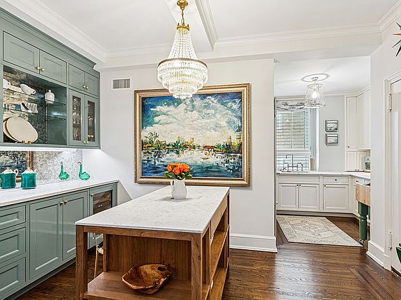 Adjacent to the kitchen is a separate flexible dining room currently curated with a marble breakfast bar to complement the stunning custom built-in high gloss lacquered beverage station, with an antiqued mirror backsplash, abundant storage, a wine refrigerator, gorgeous durable quartz countertops, and finished with a one-of-a kind vintage French chandelier.