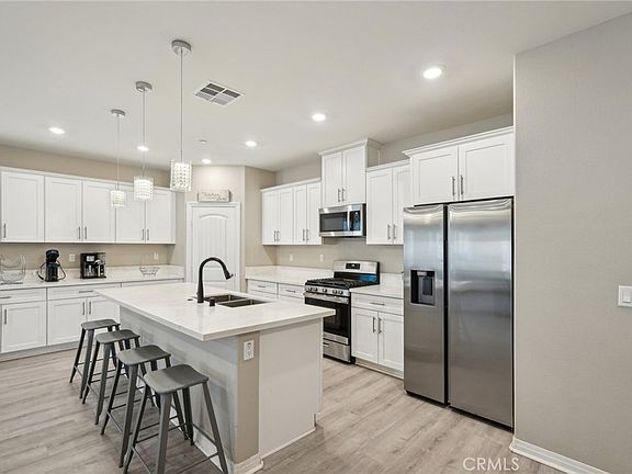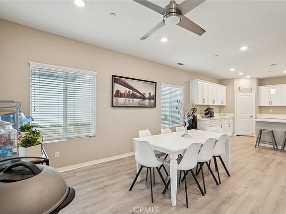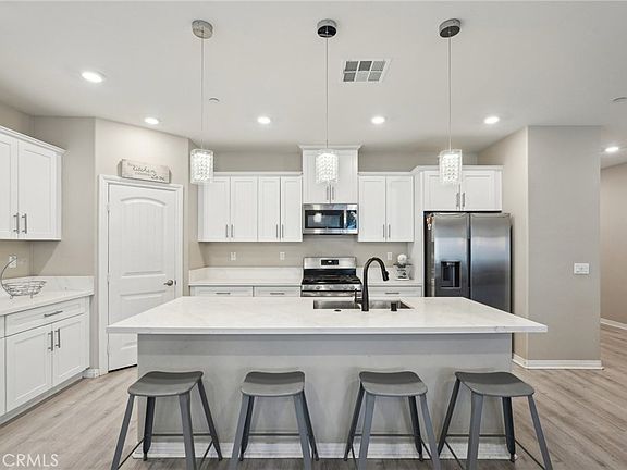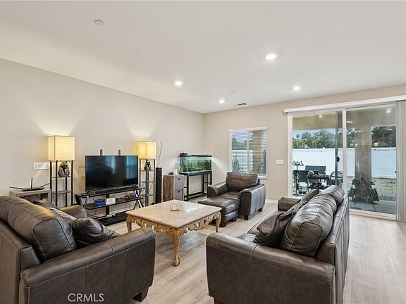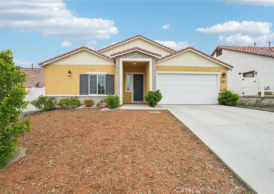 Spacious, like-new home, built in 2023, offers Owned Solar Panels, as well as great curb appeal with low maintenance landscaping! The interior offers high ceilings, an open floorplan, recessed lights, vinyl plank floors, and a neutral paint scheme. The kitchen features quartz counters, a center island with breakfast bar seating, white cabinetry, a pantry, and stainless steel appliances. The kitchen overlooks the great room with living and dining area. The huge primary suite has a spa-like ensuite with dual sinks, a soaking tub, a separate shower, and a walk-in closet. Three of the secondary bedrooms sit in a cluster to the left of the main entry hall and share a full-size bathroom with dual sink vanity at the end of the hallway, and there is a 5th bedroom on the right side off of the entry hall also with a full-size bathroom, great for multi-generational living. Enjoy the private, no maintenance backyard with rockscaping and covered patio with built-in lighting, this space is ready for the new owner's design! This home also has an attached 2-car garage, and is conveniently located near schools, shopping, dining, the 215 Fwy, and No HOA! Don't wait, schedule your tour today!