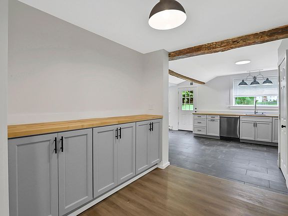 Downstairs, you'll find a bright and inviting living room that flows seamlessly into a formal dining room, creating the perfect space for entertaining. The eat-in kitchen boasts brand-new stainless steel appliances, a dishwasher, slate tile flooring, and granite countertops. A full bathroom with a soaking tub adds to the convenience. The laundry area includes a front-loading washer and dryer, while a pantry with brand-new cabinetry provides ample storage. There is also a bonus front room that can serve as a fourth bedroom, office, or den, offering flexibility for your needs. A charming front porch invites you to relax and take in the peaceful surroundings. The home also includes a utility room with a new high-efficiency boiler and a whole-house UV water filtration system.