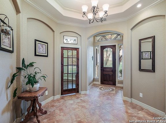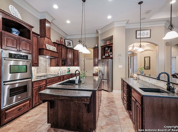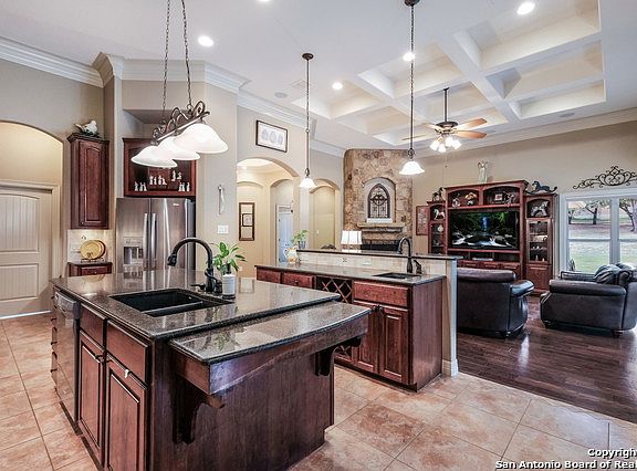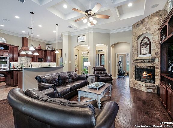 Stunning 4Bd/2.5Bth in Eden Crossing*ADA Access. Flr Pln features Custm Built-ins & Cabinetry plus Gorgeous Tile & Wd Flooring, Beautiful Stone Fireplaces in Fmly Rm & Outdr Living Rm, & Abundant Natural Lt*Gourmet Dine-in Kitchen has Large Island & Breakfast Bar, Gas Cooking, & Stainless Appliances*Wine Rack w/ faux wall plumbed for Ice Machine*Built-in Surnd Sound in Fmly Rm & Patio comes w/ receiver*Pre-wired for Pool/Ex Lrg LP tank for pool heat*String lights out bk excluded.
