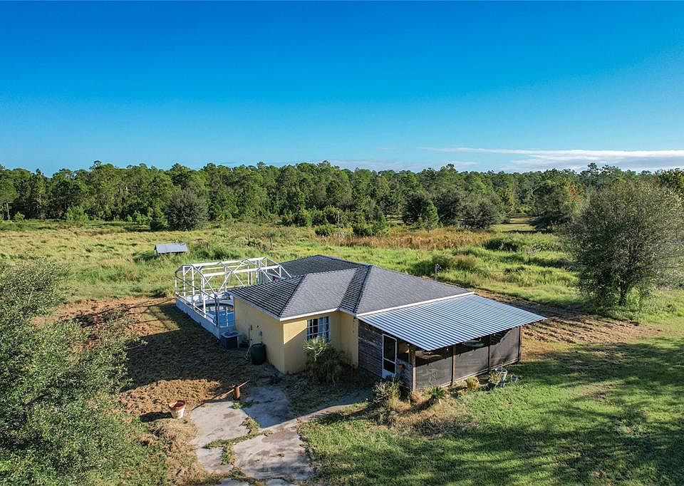 Discover the perfect blend of tranquility and potential with this charming 2-bedroom, 2-bathroom pool home nestled on a sprawling 5.12-acre lot in the serene town of Frostproof. This hidden gem offers a unique opportunity to create your dream oasis. Upon entering, you'll be greeted by a spacious living area full of natural light. The open floor plan seamlessly connects the living room, dining area, and kitchen, making it ideal for hosting gatherings and creating lasting memories. While the flooring may need some TLC, it presents an excellent chance to personalize the space to your taste. Imagine choosing the perfect materials to suit your style and transform this home into your very own sanctuary. Step outside onto the big covered porch and take a deep breath of fresh air, this is the perfect spot to relax, entertain, or simply enjoy the serenity of your surroundings. With ample space, you can effortlessly create your own outdoor retreat, complete with cozy seating areas and lush greenery.As an added bonus, this property features a sparkling pool, providing a refreshing escape during those warm summer days. Imagine taking a dip in the crystal-clear waters, surrounded by the beauty of your expansive 5.12-acre lot. So bring all your animals and come enjoy countryside living!!!!