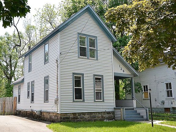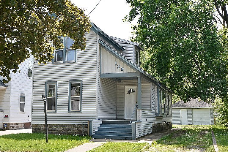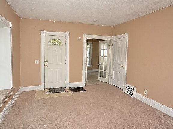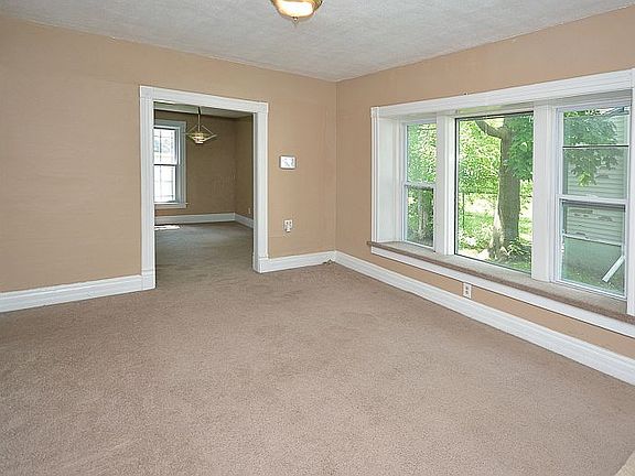 The house has a first floor bedroom and large living room. The bow window in the living room has a carpeted seating area.