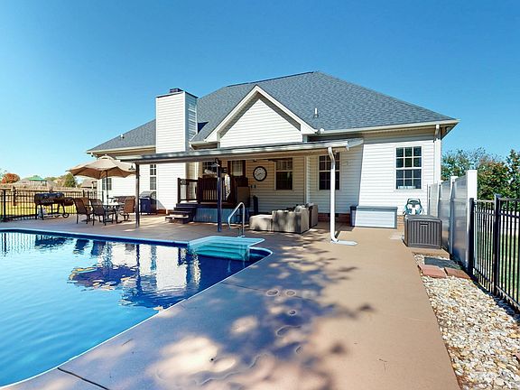 Step outside to a covered patio perfect for entertaining, overlooking the in-ground pool with a stunning rock waterfall and new liner (Fall 2024). The pool area is enclosed with decorative iron fencing, while the rest of the backyard features a privacy fence, open green space, and a new storage building (10X20 bought in fall of 2024) that will remain.