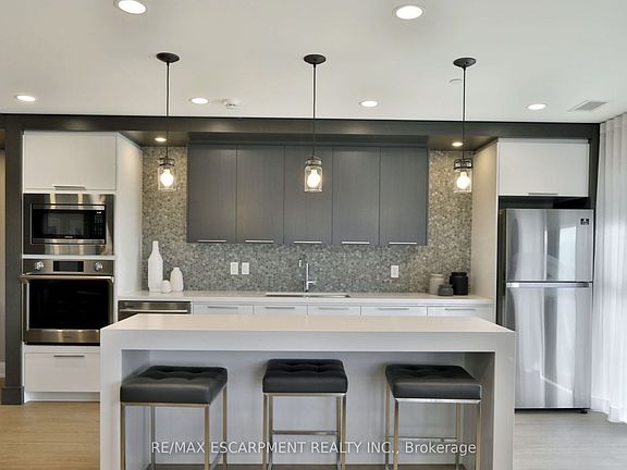 Experience Elevated Living in Uptown Oakville. Discover upscale urban living in this sophisticated one-bedroom penthouse suite in the heart of Uptown Oakville. The highly sought-after Bronte model offers a thoughtfully designed layout with soaring 10-foot ceilings and a private 47 sq. ft. balcony an ideal spot to unwind or entertain. This upgraded residence showcases a designer kitchen with extended stacked cabinetry, a striking waterfall-edge quartz countertop, and premium GE stainless steel appliances. Elegant finishes include wide-plank flooring throughout, mirrored sliding closet doors, custom roller shades, and a sleek frameless glass shower. Practical conveniences include one underground parking space and a storage locker. Located just steps from everyday essentials Superstore, Walmart, LCBO, Dollarama, Bulk Barn plus an array of restaurants and cafés. Commuters will appreciate seamless access to Highways 403, 407, and the QEW. Whether youre a professional, couple, or investor, this turnkey penthouse offers refined living in one of Oakvilles most vibrant communities.