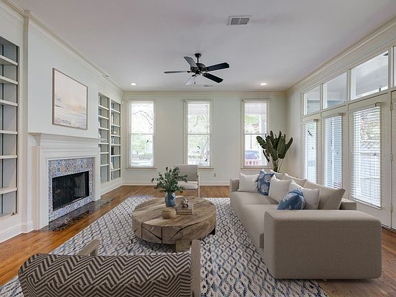 Harbor Town home w/4 bds + office or 5 bds and 3 full baths. Fantastic outdoor spaces including balcony, spacious porch, back patio & fenced yard. Downstairs has open floorplan w/tons of natural light. Pretty hardwood floors throughout home. 1 of the bedrooms can be used as a safe room (tornado) with reinforced walls and floors, steel doors & steel shutters. Roomy primary suite has large walk-in closet and ensuite with separate shower and whirpool tub. Back load 2 car garage. Both furnaces replaced in 2022