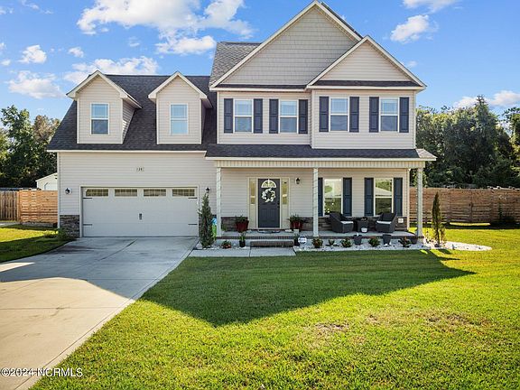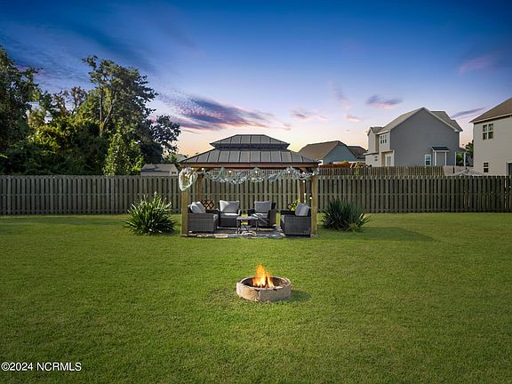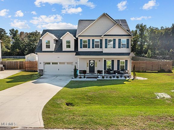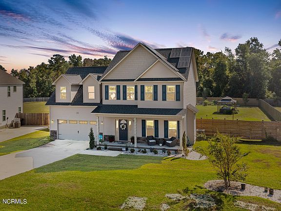 Welcome to 128 Heron Watch Drive, a stunning home nestled just near Swansboro — the friendly city by the sea! This unique abode truly stands out among the rest and has ALREADY APPRAISED AT ASKING! At only 4 years young, it features an extraordinary blend of modern upgrades and eclectic charm. Situated on nearly ¾ of an acre, this property is truly a gardener's paradise, featuring fig trees, flourishing herbs, and an abundance of home-grown veggies. The backyard also boasts a beautiful gazebo, perfect for relaxing in your private oasis, along with a play yard for the little ones and a charming little custom hut for your furry friends! To make your green thumb even easier to manage, the garden is equipped with its own water hookup and automatic timer! To add, the home's eco-conscious solar panels bring energy efficiency to your everyday life. While inside, you'll find a meticulously designed space featuring luxury vinyl plank (LVP) flooring throughout the downstairs. The kitchen is a chef's dream with sparkling white cabinetry, granite countertops, and ample storage space for all your culinary needs. Adjacent is a formal dining room — perfect for hosting... and an elegant living room complete with an electric fireplace that creates a cozy atmosphere for gatherings. The primary suite is a retreat of its own, featuring a tray ceiling, 2 walk-in closets, and an en-suite bath with dual sinks, a separate shower, and a relaxing soaking tub. To top it all off, additional modern upgrades include a tankless water heater and a whole home water treatment system! This rare beauty offers the perfect blend of style, comfort, and sustainability—a true hidden gem in all its glory, glistening in the sunlight... just waiting for you!