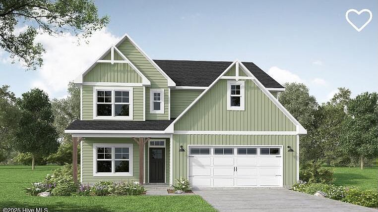 Exterior features low-maintenance vinyl siding with board-and-batten accents, dimensional roof shingles, front porch with SW ''Watery'' door, and smart keypad entry.