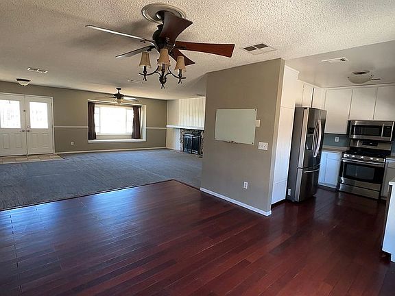 Centrally located near shopping, schools, and amenities, this charming home features an enclosed front yard with wrought iron fencing, a paver patio, and a stunning wall of jasmine with low-maintenance landscaping. Step through the double-door entry into a spacious living room with a bay window and fireplace. Real wood flooring flows through the dining room, kitchen, hallways, and one bedroom, while new carpet graces the living room, master, and remaining bedrooms. Ceiling fans are in every room for year-round comfort.
