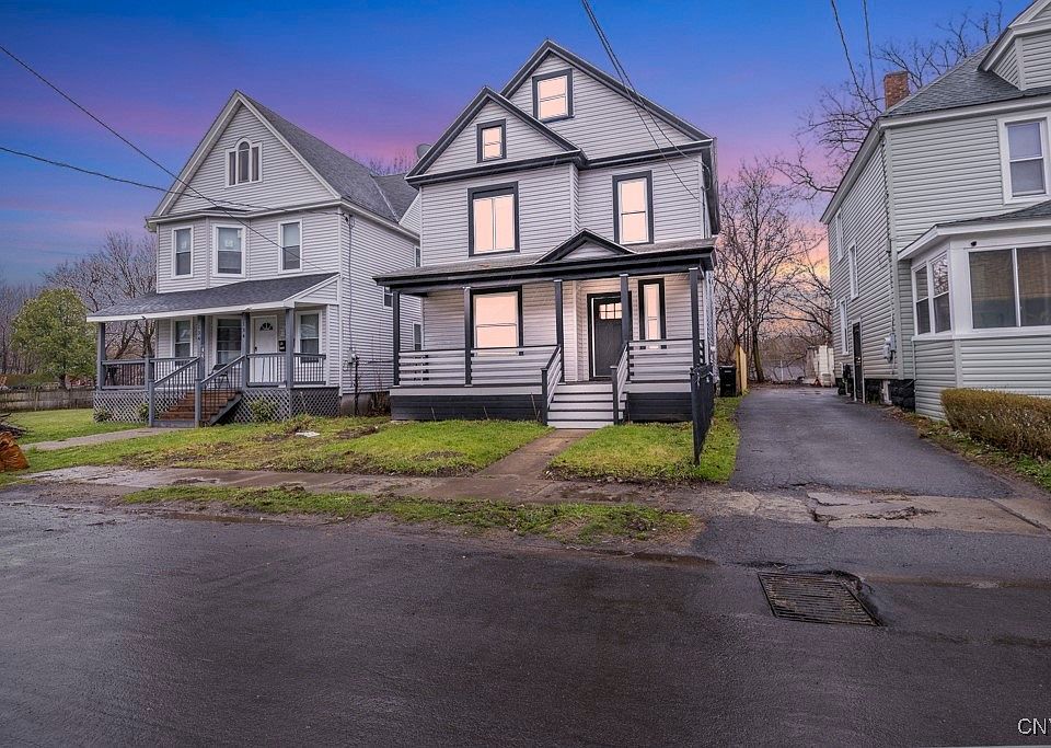 Welcome to 128 Richardson Ave, where classic charm meets modern elegance in the heart of Syracuse. From the moment you step onto the covered front porch you'll notice this house has been thoughtfully updated from top to bottom. Inside you're greeted by a striking staircase with rich painted woodwork setting the tone for a space that's stylish and inviting. The main level offers effortless flow between living and dining spaces and contemporary full bath. All enhanced by sleek luxury vinyl, fresh white walls and contemporary light fixtures that add just the right amount of edge. The Living room is generously sized and thoughtfully divided into two distinct sections, offering flexibility to fit your lifestyle. The kitchen is a STUNNER! Clean white shaker cabinetry, quartz countertops, brass hardware and new stainless-steel appliances complete the look, creating a space that's as functional as it is beautiful. Large formal dining area off the kitchen. Upstairs you'll find another chic and updated FULL bath and 3 spacious bedrooms. The largest bedroom boasts a large walk-in closet. The space is also split into 2 distinct spaces which could allow for a fourth bedroom, nursery, office space or just a large “suite” style bedroom. HUGE attic upstairs for storage or potential for additional space! Recently updated mechanicals make this beautiful home turnkey and ready for its new owners. Conveniently located near parks, schools and everything the city has to offer. Don’t miss out on this bold contemporary gem unlike any other. Schedule your showing today!