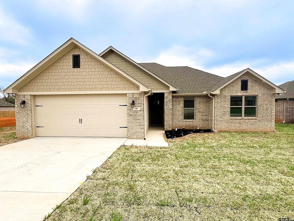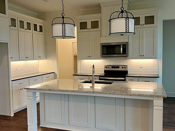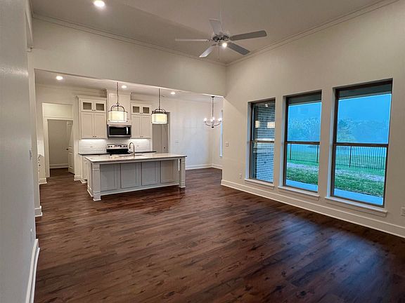 Completion August 2023. High ceiling living room Large windows Stainless appliances Air fryer oven function Granite counter tops Custom cabinets with glass display toppers Gold fixtures Large back porch Split bedrooms Custom master bedroom ceiling His & hers master bathroom vanities Soaker tub Walk-in tile shower Vanity and toilet in separate rooms Large mirrors Master closet and Laundry room connected Large walk in pantry Extra-Large insulated storage area above garage Wi-Fi controlled garage door St. Augustine grass Irrigation system Upgraded water heater Gas heating unit