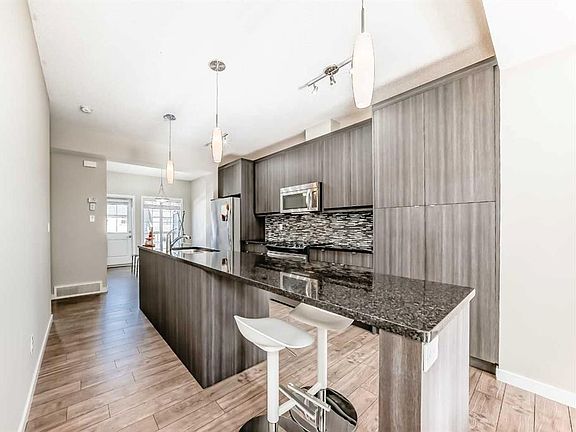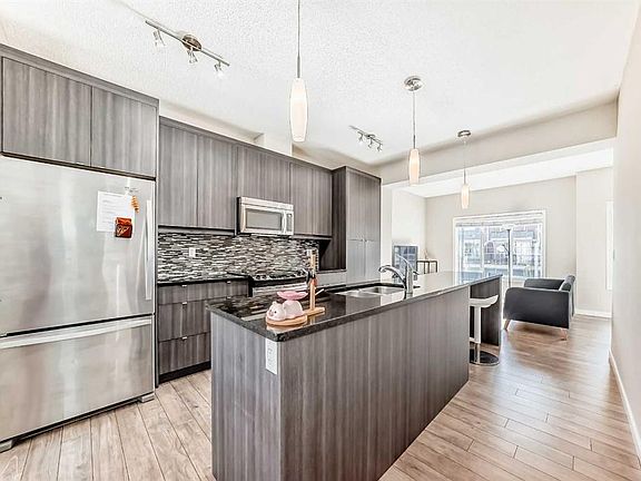 Welcome to this charming 2-bedroom plus den townhouse nestled in the picturesque lake community of Mahogany! Perfect for investors, first-time buyers, or those looking to downsize, this home showcases a modern open-concept design with 9-foot ceilings that seamlessly connect the living room, dining area, and chef’s kitchen. The kitchen is a standout, featuring sleek granite countertops with an extended island, stainless steel appliances, pantry, and ample storage. Step out onto the sunny balcony with gas line, ideal for barbecues and evening sunsets. Upstairs, you’ll find two spacious primary bedrooms, each with its own ensuite and generous closets—offering privacy and convenience whether for family, roommates, or guests. A versatile den on the main floor adds extra flexibility for a home office, reading nook, or hobby space. Additional features include newer carpet upstairs, air conditioning, upstairs laundry, and a two-piece bath on the main floor. The tandem garage provides room for two vehicles or extra storage, with direct access to the back lawn, while the private driveway allows parking for a third vehicle. The well-managed complex is built with durable James Hardie siding and offers visitor parking close by. Enjoy all that Mahogany has to offer—four-season lake access, a vibrant community center, playgrounds, walking paths, and trendy shops and restaurants nearby. This beautifully appointed townhouse is move-in ready and a great opportunity to experience the best of Calgary’s premier lake community living.