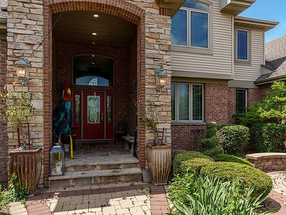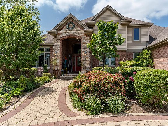 Welcome to this brick masterpiece on the fairway of Timber Point Golf Course. Boasting over 5,000 sq. feet of living space, this custom-built home was a 2003 Parade Home! The spacious foyer opens to the 2-story great room with floor to ceiling windows flanking the full Chilton stone fireplace and featuring a custom mural of a quaint town in Italy. The handsome main floor office makes working from home incredibly enjoyable. The formal dining room also features a custom painting on the ceiling. The chef's kitchen opens to both the enclosed rear porch and the great room, ensuring the chef is always part of the party. The kitchen features maple cabinetry, a granite center island, pantry, tons of storage and a large eat-in area. The main floor primary suite offers a full ensuite with separate shower, tub and a large walk-in closet. The welcoming foyer, dining room and great room have beautiful Brazilian Cherry flooring. The second level offers three bedrooms. The first bedroom has its own bath, and the other two bedrooms share a Jack-n-Jill bath. The lower level feels like a whole other home with a wet bar, theater room, 5th bedroom, full bath, media area and billiard area. The enclosed porch leads to the outside entertaining area with its pizza oven, grilling area and Pergola, plus there is inground sprinklers, professionally landscaped lawn, water feature and security camera. Furnace and A/C (2021), Water Softener (2025), Water Heater (2023). This home is a true gem with its ample living space, thoughtful features and functional design! A WOW!