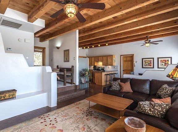Beautifully updated passive solar, light, bright and filled with cascading sunlight, Central Air Conditioning, carved front door, brick floors, Kiva fireplace, beamed ceilings and spirit walls add Santa Fe touches to the open and inviting floor plan. Cooks kitchen complete with granite counter tops, glass back splash, high end Bosch, and LG appliances, lovely cabinets and a window over the sink make cooking fun. Fenced back yard with a wisteria draped ramada offers a place for quiet times to swing and take in the view or simply enjoy the serenity of this nicely wooded yard. Guest bedroom features an Atrium door and offers separate entry. It would make a great Office. More Atrium doors in Master Bedroom and Living room all opening to back yard. Two full baths have been updated with stone tile, new hardware, and lighting. All of this in the ever popular Eldorado Community home to miles and miles of walking paths, wilderness preserve, stellar K-8 school, shopping, dining, summer swimming pool, library, senior center, community center and more. Yet only about 20 minutes to The Santa Fe Plaza!