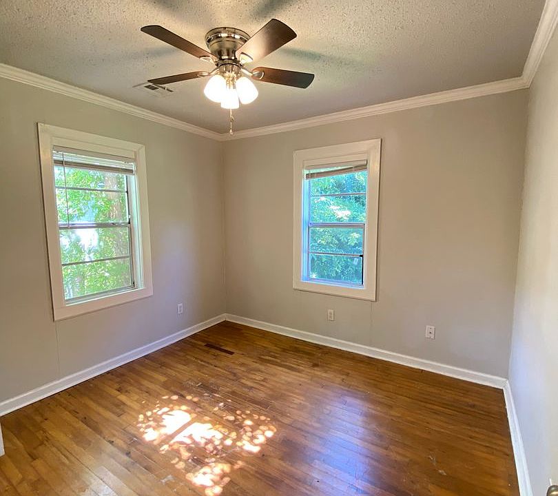 Open backyardWood floorsCeiling fansWhite stoveDedicated dining room
