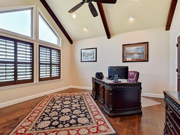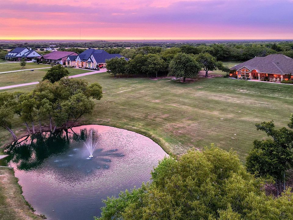 Nothing compares to this 4 bed,3 bath with en suite,3 Car Garage custom masterpiece! Key features include a safe room, attic storage with a walk-up staircase in the garage, spray foam insulation, with amazing natural privacy off three sides. It's an entertainer's dream. Open concept custom stone home features an amazing chef's kitchen with Kitchen Aide stainless appliances, a walk-in pantry, pot filler, and a center island with vaulted cathedral ceilings with dark stained beams. Great attention to detail with 61 piers under the slab, smart thermostats, on-demand water heaters, hail-resistant shingles, a massive fireplace with custom mantle, crown molding throughout, and plantation shutters. The garage is wired with 220 for a welder or your EV car. The dining area walks out to an outdoor kitchen complete with Blaze grill, sink with hot and cold water and separate entrance into two primary bedrooms. This home would make a great multi generational property.This beautiful home boasts breathtaking views with a rolling hill down to the stocked pond with a gorgeous water fountain.