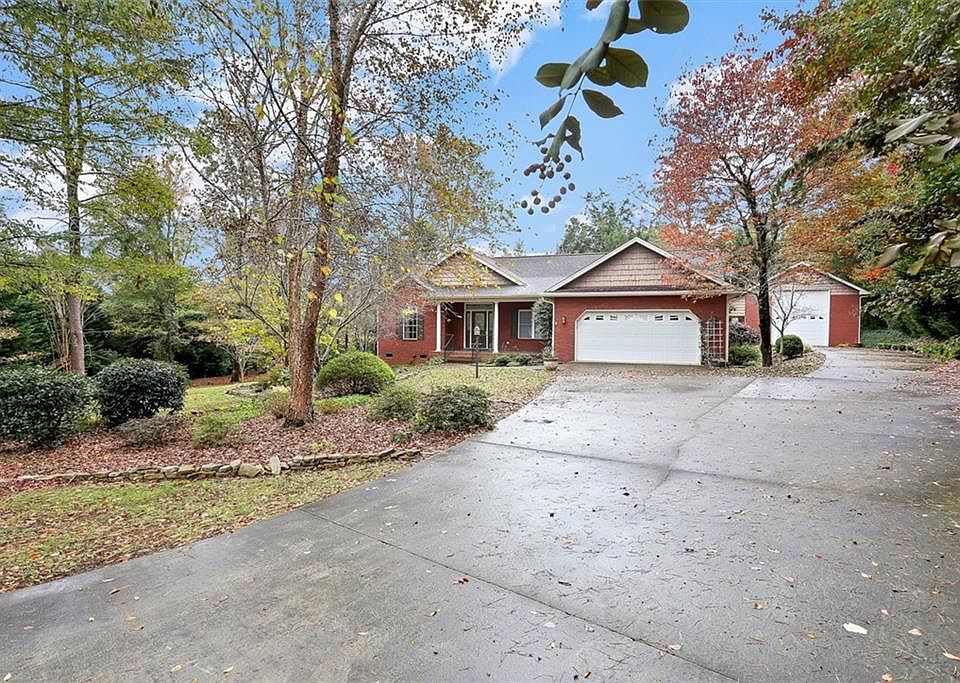 This home has it all, one level, split floor plan with open living, dining area, gas fireplace, eat in kitchen with newer appliances including a gas range. Deck from kitchen overlooks your beautiful wooded acre + lot. There is also an additional freestanding RV garage for all your toys, plus a utility sink. Garage has its own covered deck area. The yard and decks would be a lovely setting for entertaining your friends and family. All of this plus minutes away from shopping in Anderson or attending activities at Clemson or Lake Hartwell.